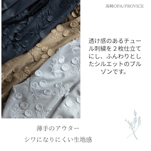 透け感のあるチュール刺繍を2枚仕立てにし、ふんわりとしたシルエットのブルゾンです。袖口はゴム使用になっており、たくし上げもスムーズです。