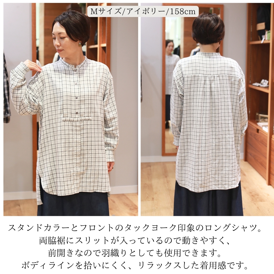 スタンドカラーとフロントのタックヨークがクラシカルな印象のロングシャツです。