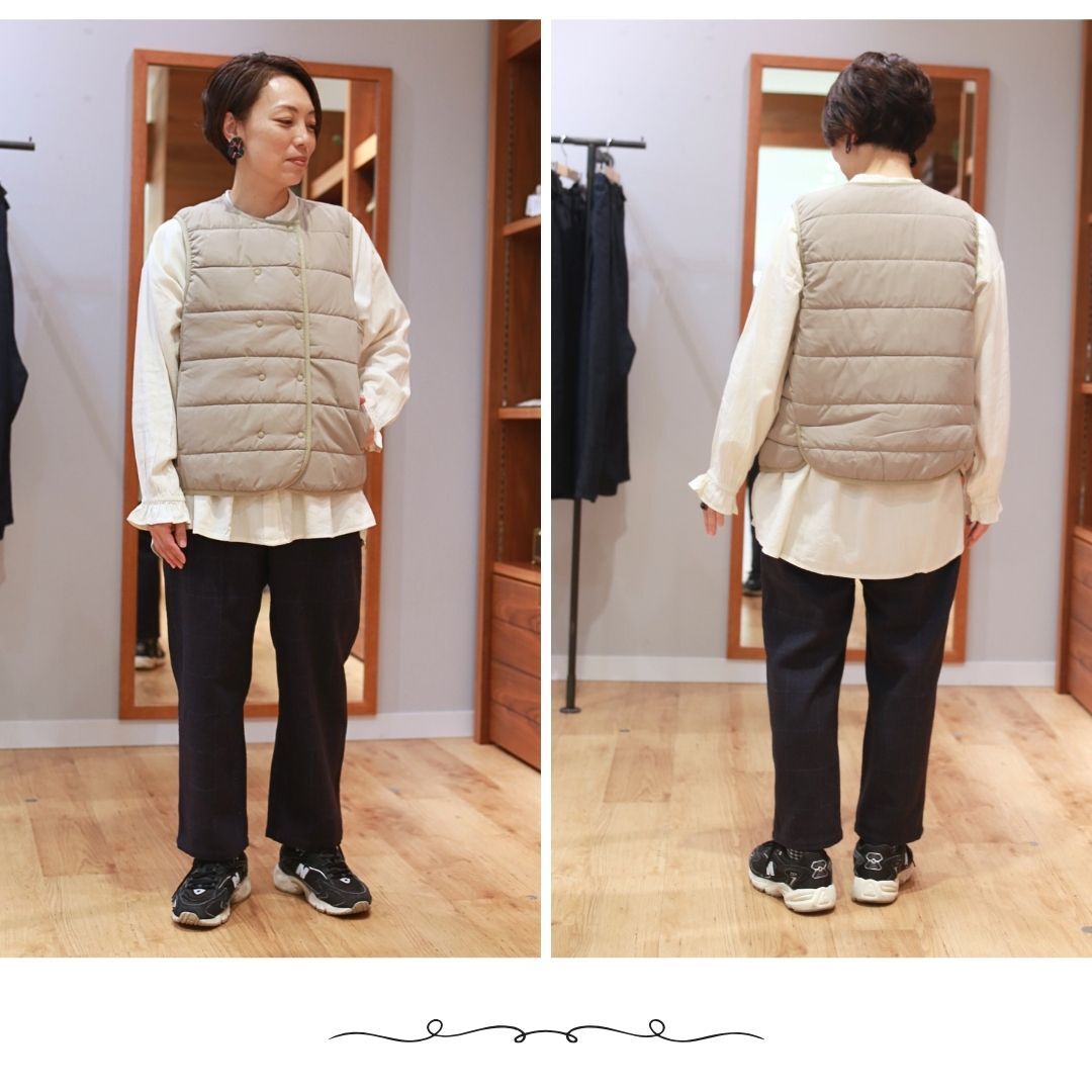 SORONA®の機能綿を使ったアウターベストです。フロントはダブル釦で保温効果を高めたデザインです。伸縮性のあるパイピング素材を使用しAHと裾は楽な着心地に仕上げています。ブラウスやニットとのレイヤードや、冬のライナーベストとしても活躍するアイテムです。