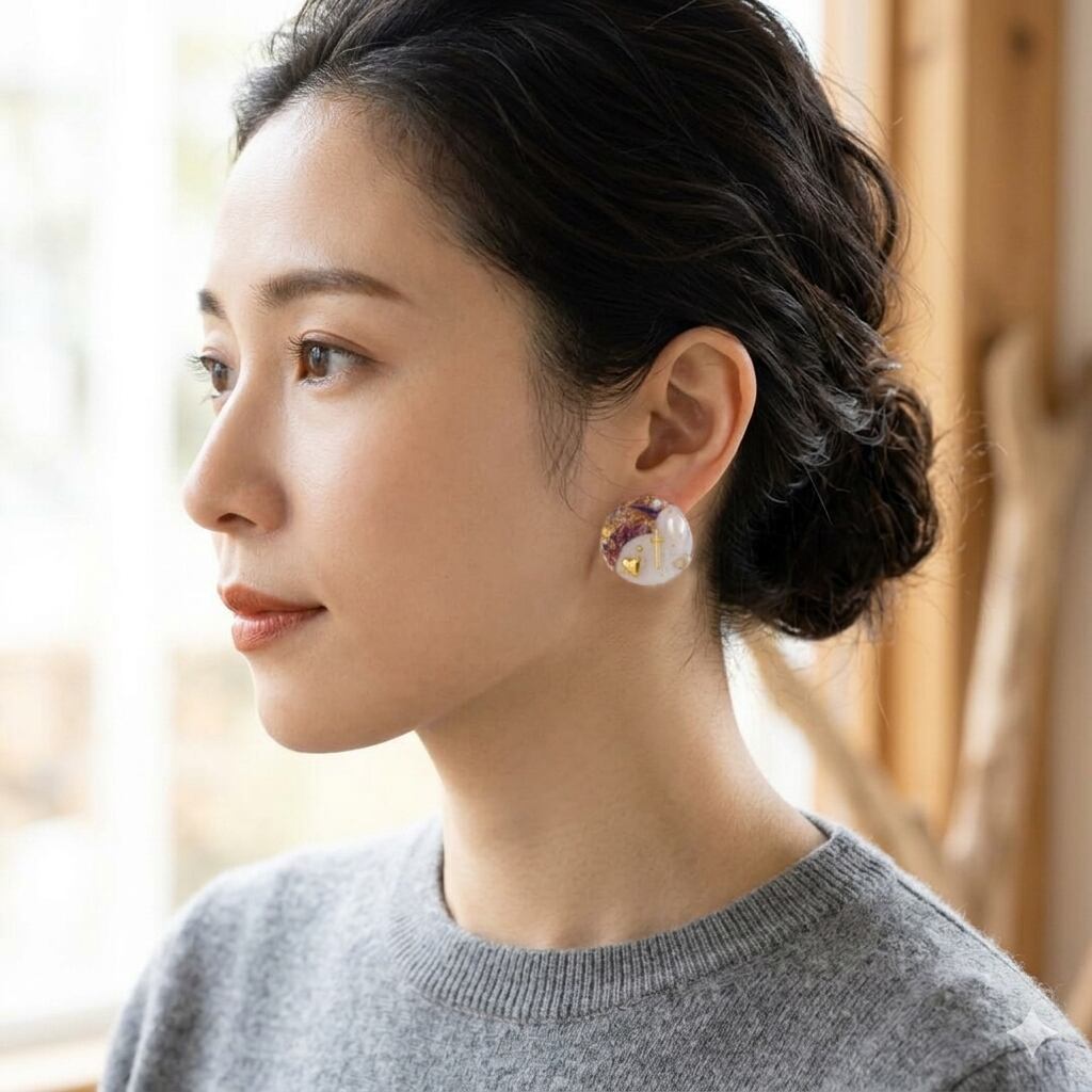 本物のお花を使用し、小さな枠にとらわれず、その先の広がりを感じられるように心がけながら作った耳飾りは一つ一つ違った表情を持っています。