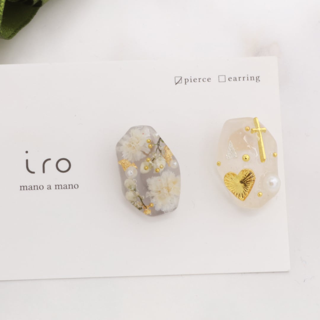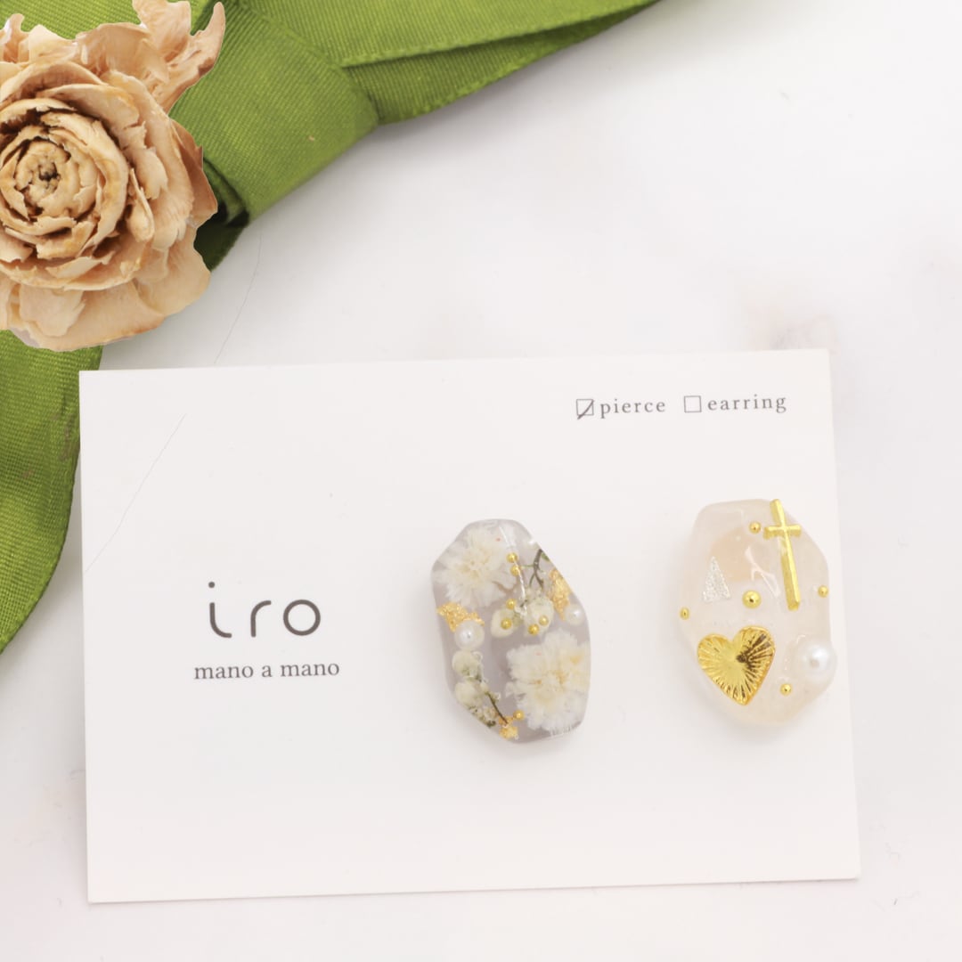 iro163イロ/鉱物大アシンメトリー/白かすみ×グレー/ピアス