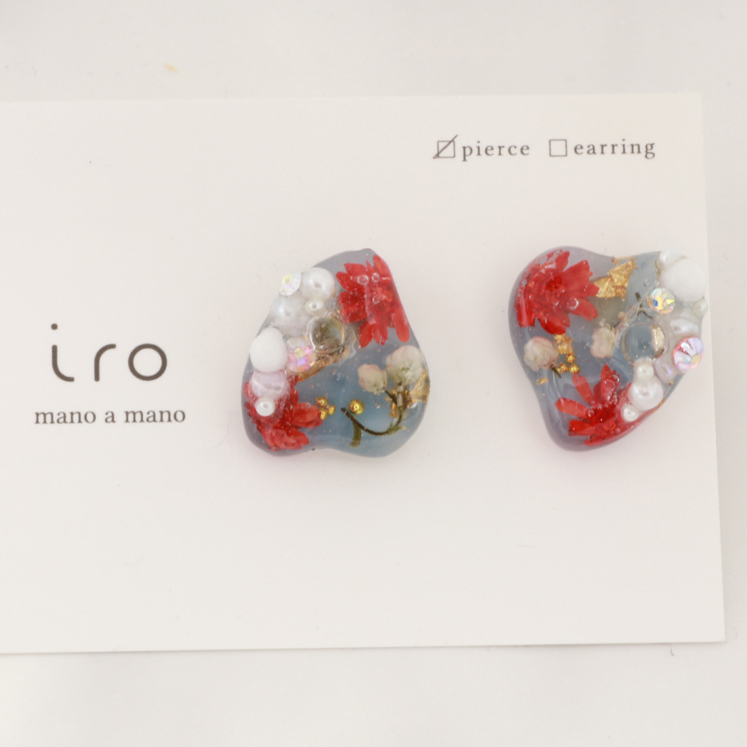 本物のお花を使用し、小さな枠にとらわれず、その先の広がりを感じられるように心がけながら作った耳飾りは一つ一つ違った表情を持っています。
