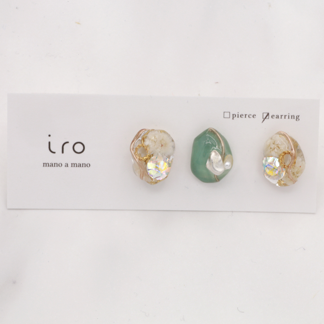 iro266イロ/鉱物3粒/白かすみRグリーン/イヤリング