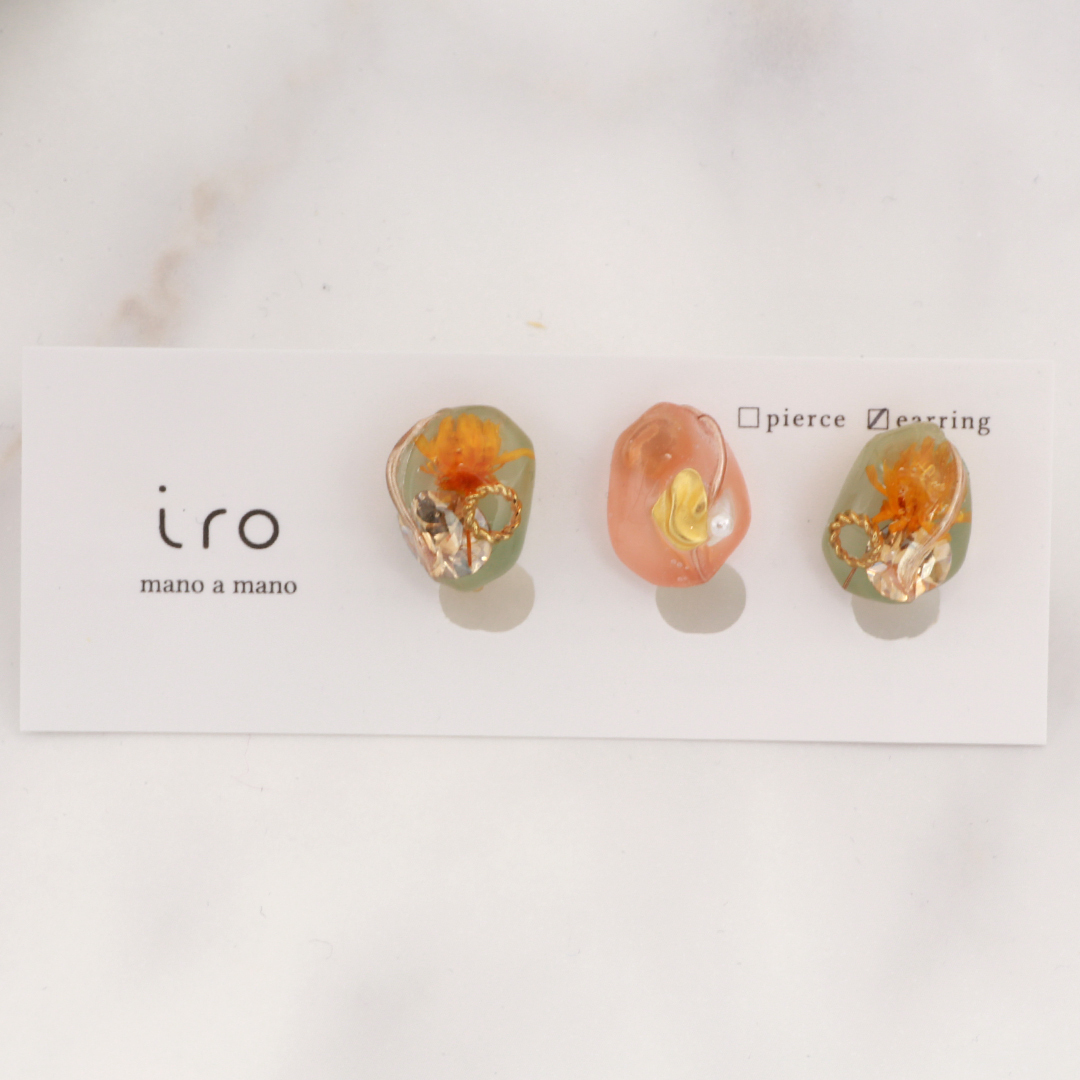 本物のお花を使用し、小さな枠にとらわれず、その先の広がりを感じられるように心がけながら作った耳飾りは一つ一つ違った表情を持っています。