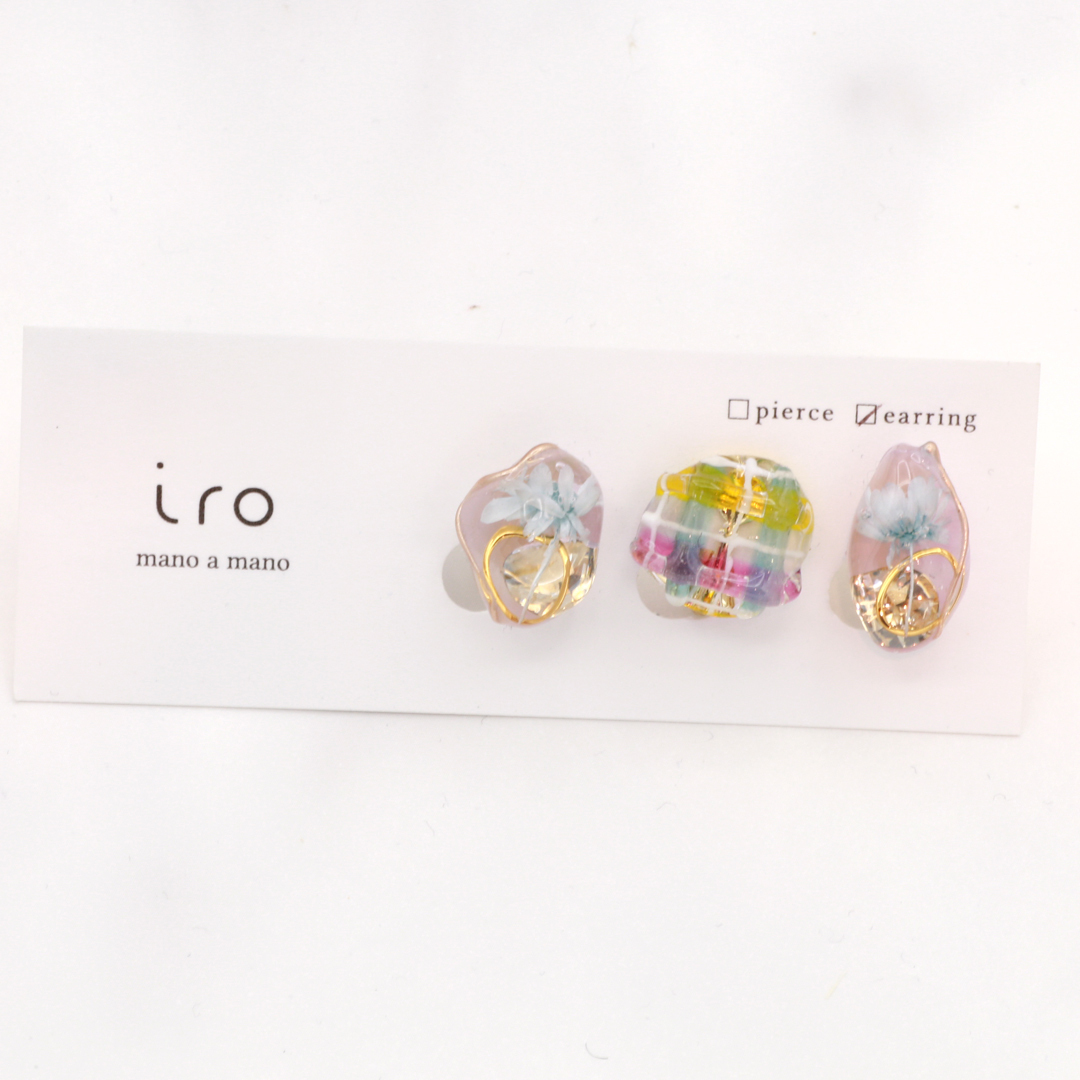 iro272イロ/石ころ3粒+チェック柄/水(ピンク)/イヤリング