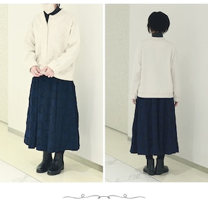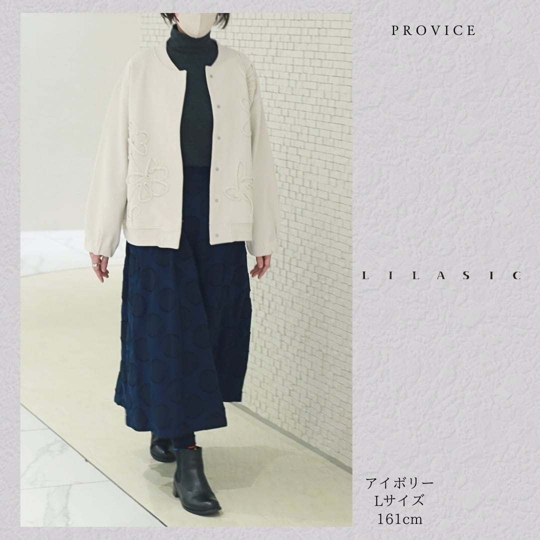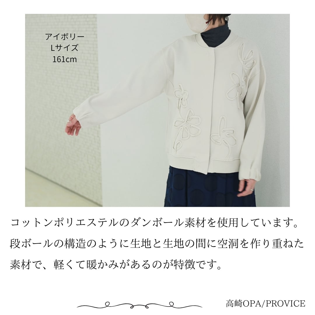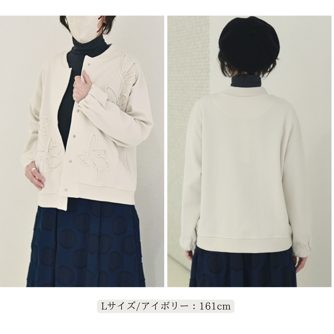 ブレード刺繍が目を引くデザインで、ブルゾンのような中間アウターの感覚で取り入れられるカーディガンです。クルーネックの襟ぐりで、タートルネックを重ねるなどのレイヤードも楽しみやすいデザインです。ブレード刺繍はこの季節に開花するシクラメンをイメージしています。