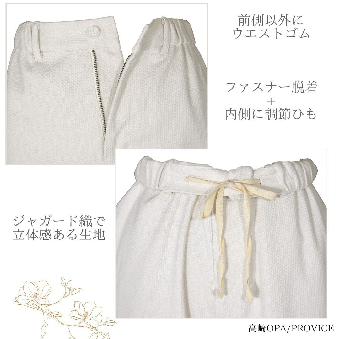 脇から後ろウエストにかけてゴムを入れた仕様のテーパードパンツです。前中心付近にはゴムを入れずにすっきり見えるサイズ感で仕立てました。前開き、両脇、後ろポケットあり。