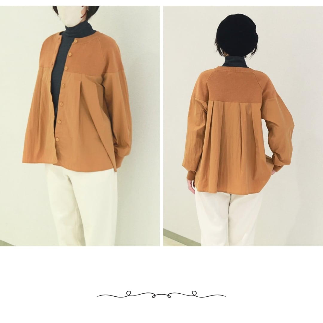 ニットと布帛素材をドッキングしたカーディガンです。