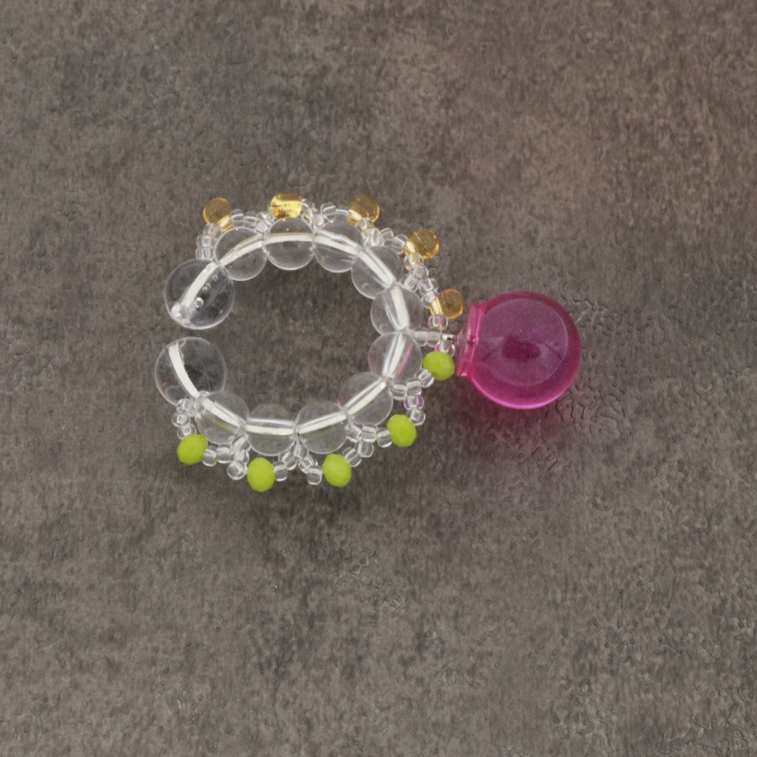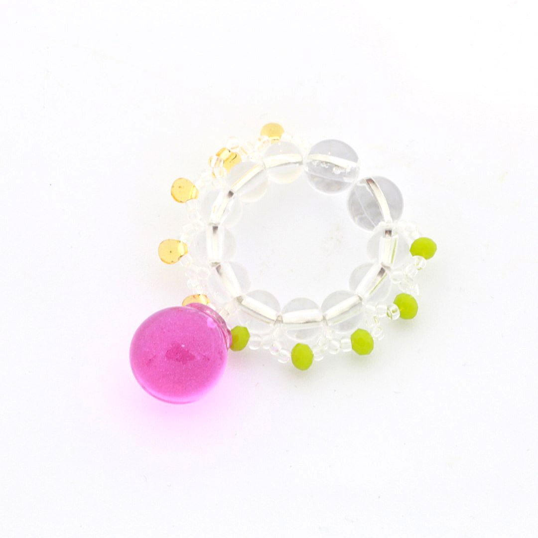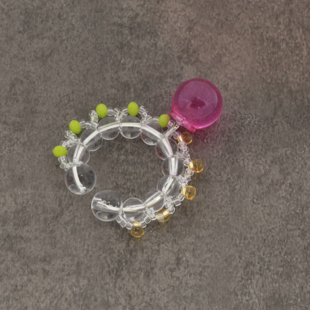 金属、石、ガラス、ビーズなど様々な粒が織り成す