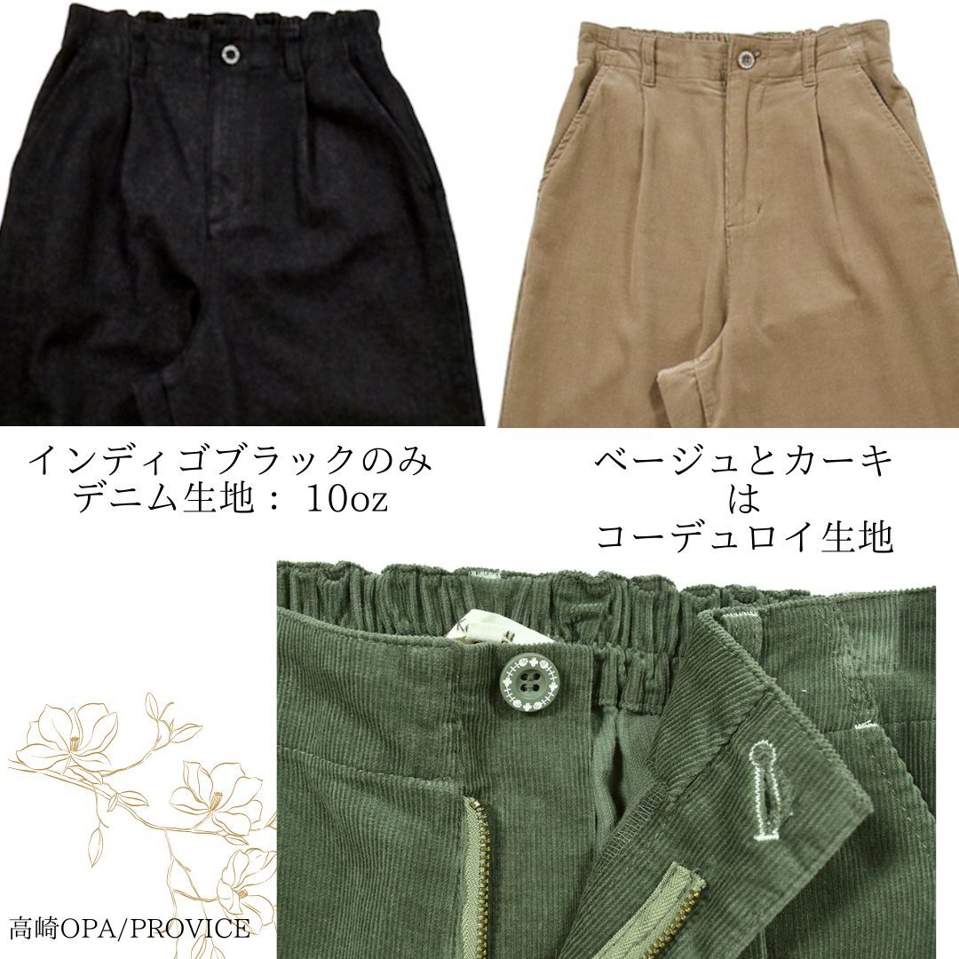 インディゴブラックは10オンスの程よい厚みのデニム生地、ベージュとカーキはあたたかい細