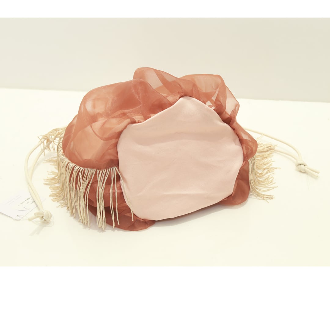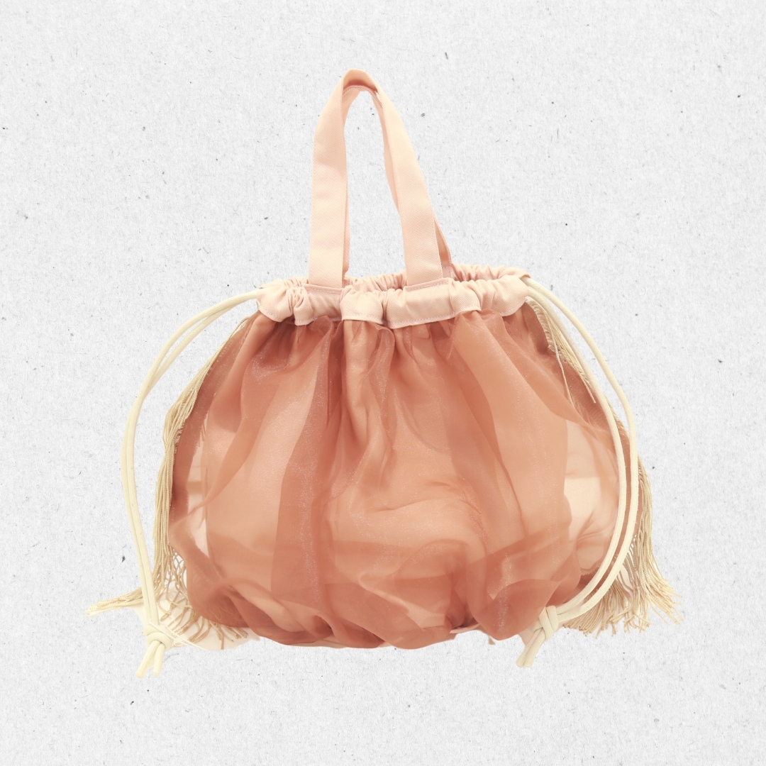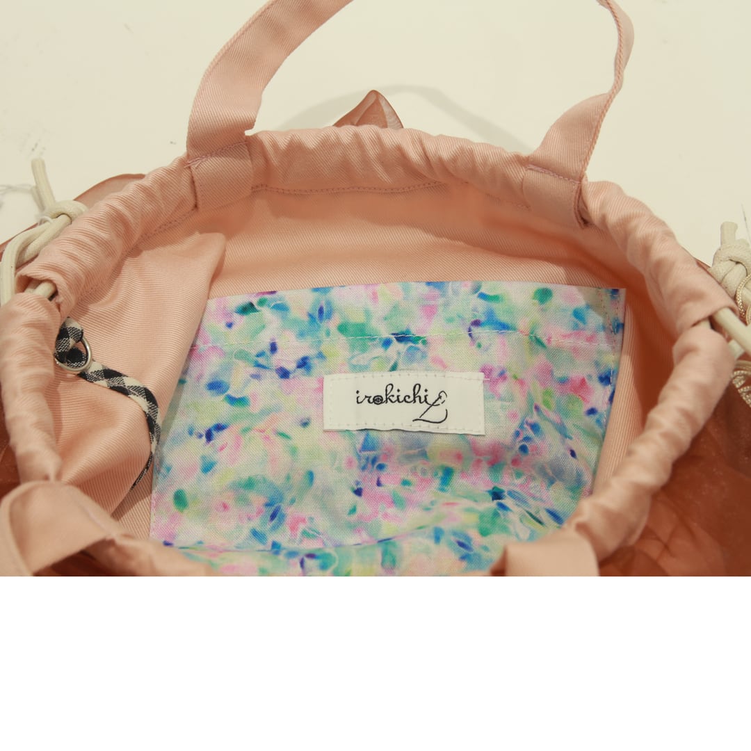 色や質感にこだわり、コーディネートのアクセントになるようなファッションアイテムを製作しています。オーガンジーの巾着トートやショルダーバッグなど。