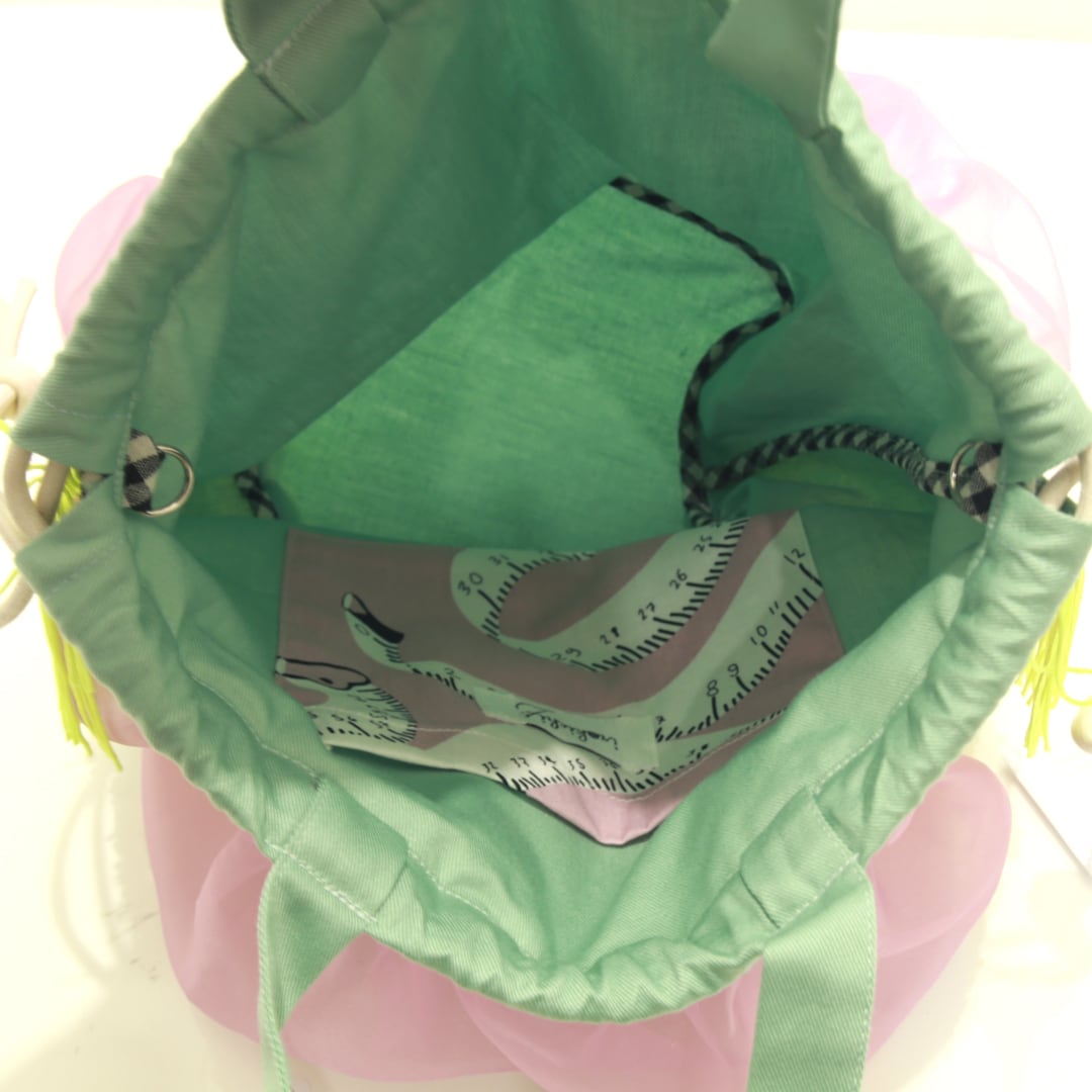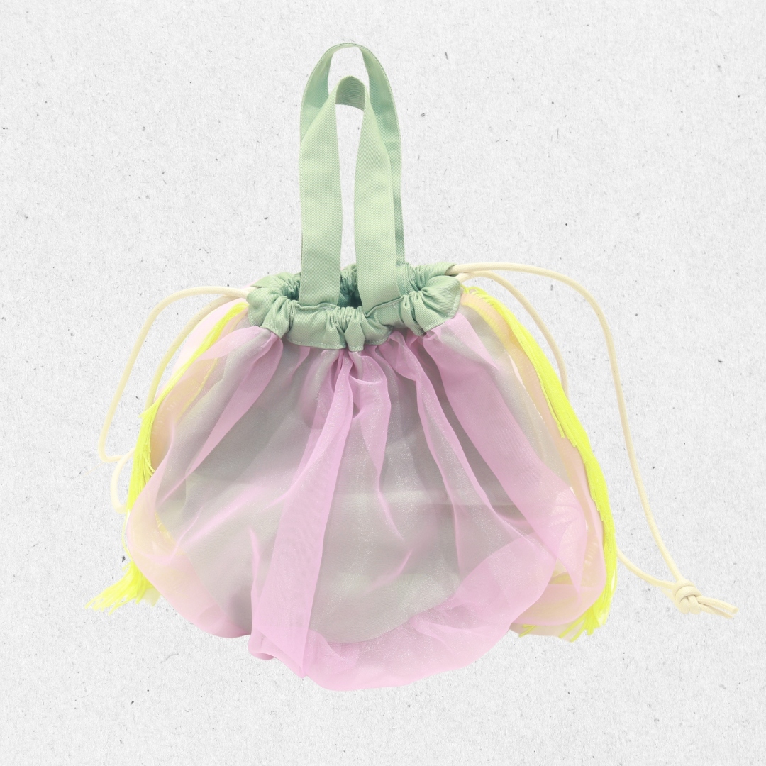 色や質感にこだわり、コーディネートのアクセントになるようなファッションアイテムを製作しています。オーガンジーの巾着トートやショルダーバッグなど。