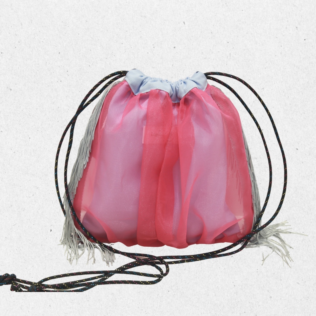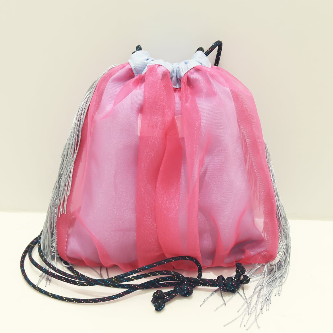 色や質感にこだわり、コーディネートのアクセントになるようなファッションアイテムを製作しています。オーガンジーの巾着トートやショルダーバッグなど。