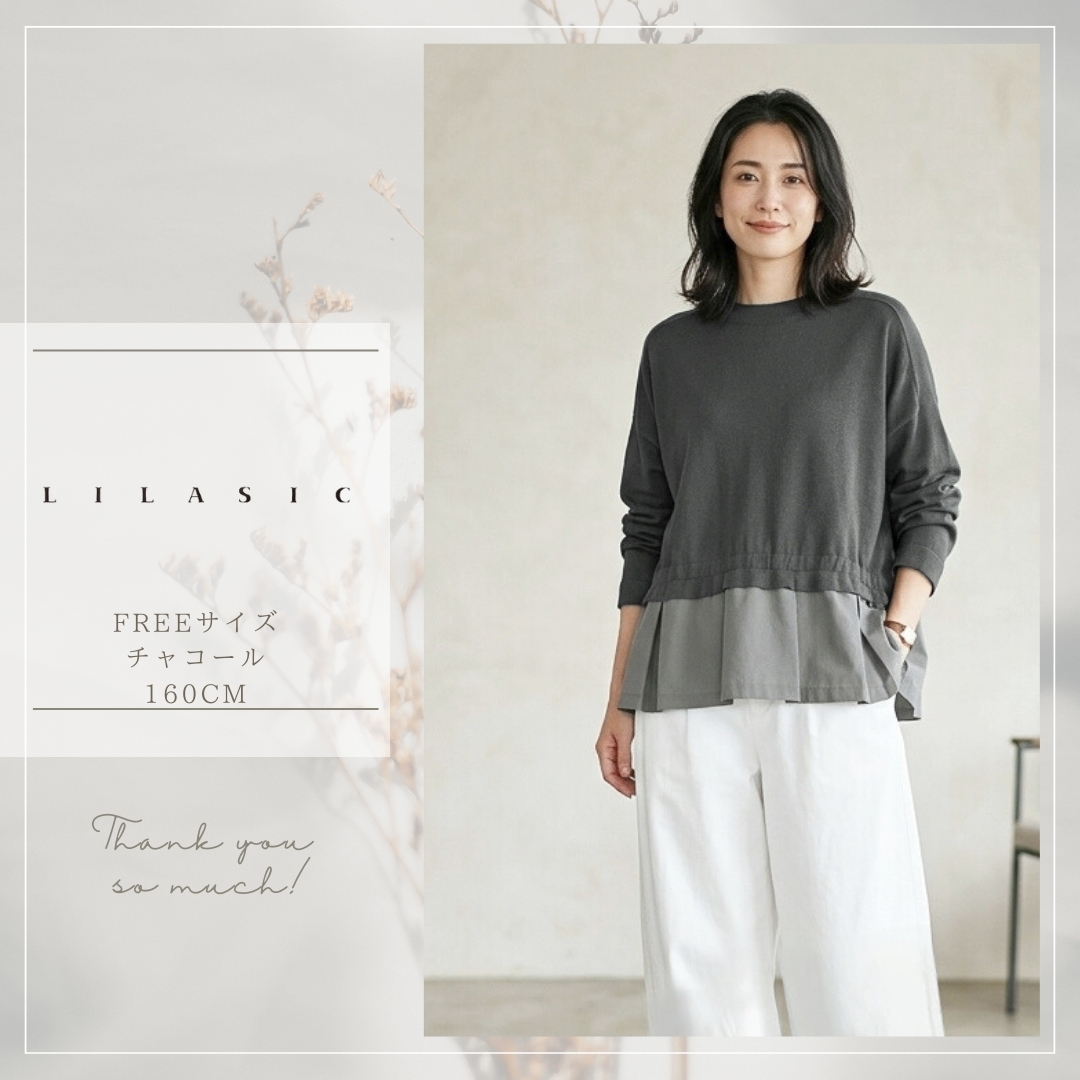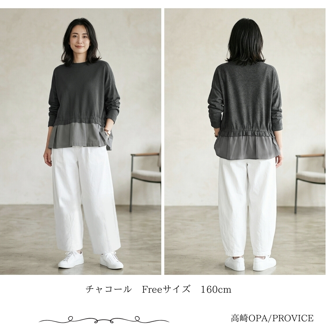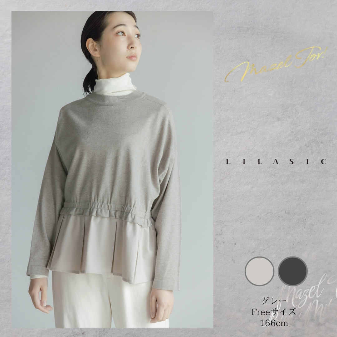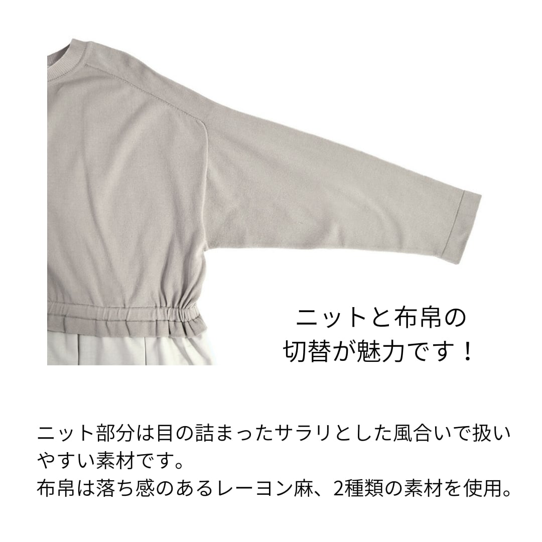 身頃上はニット、裾の切り替え下は布帛を組み合わせたプルオーバーです。