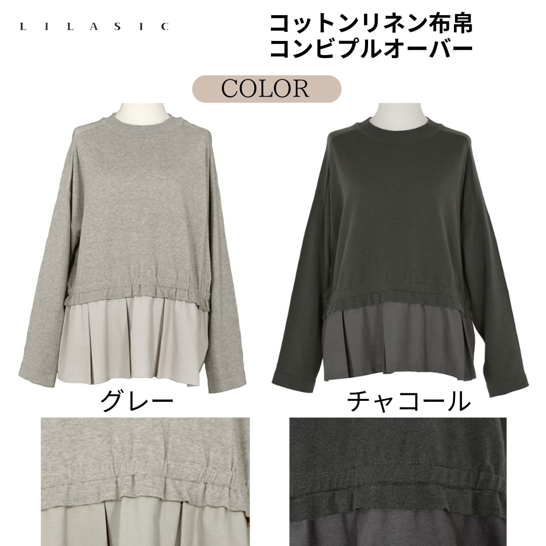 LILASIC/SAS36005/リラシク/コットンリネン布帛コンビプルオーバー /春夏カットソー/フレアトップス/切替プルオーバー/異素材トップス/春夏布帛