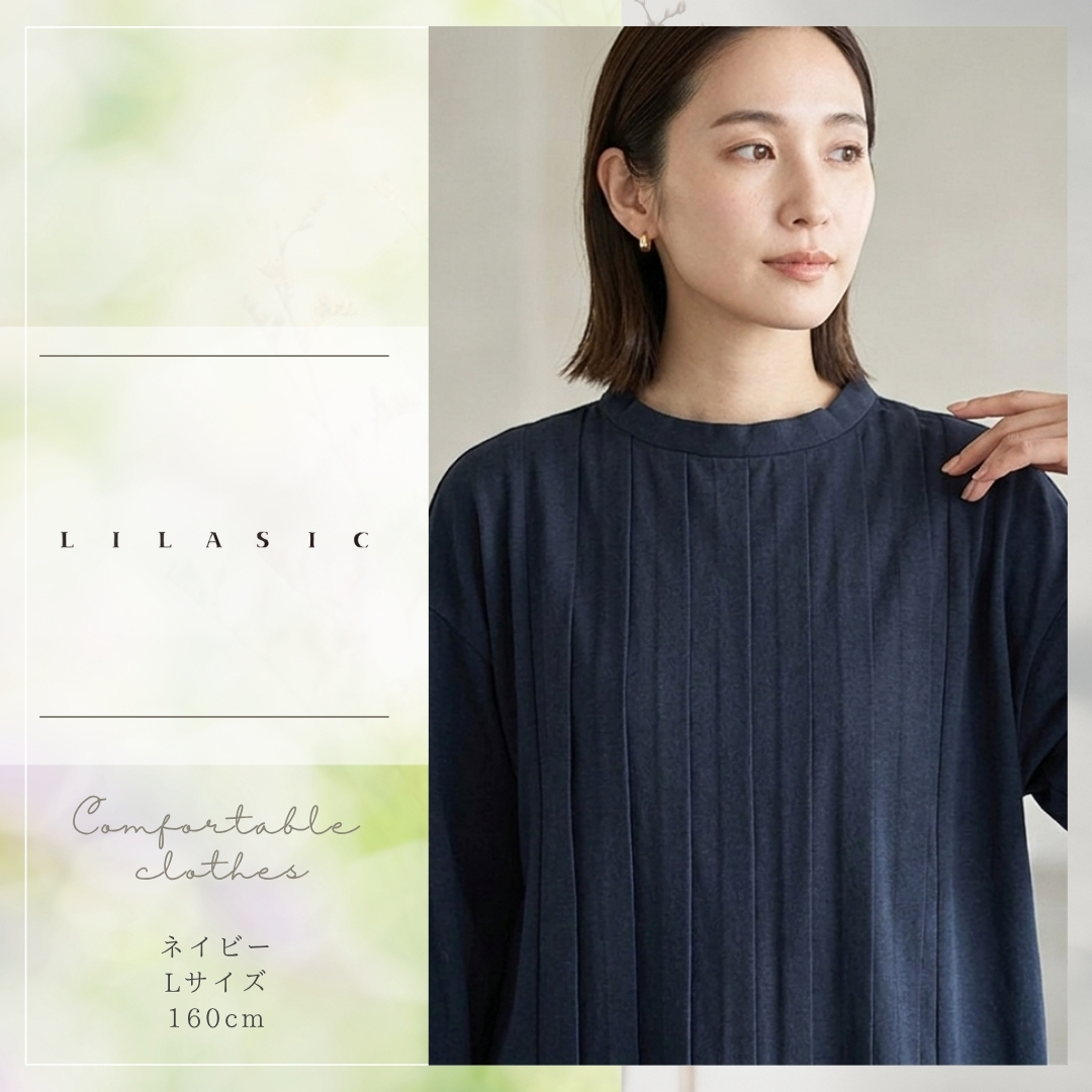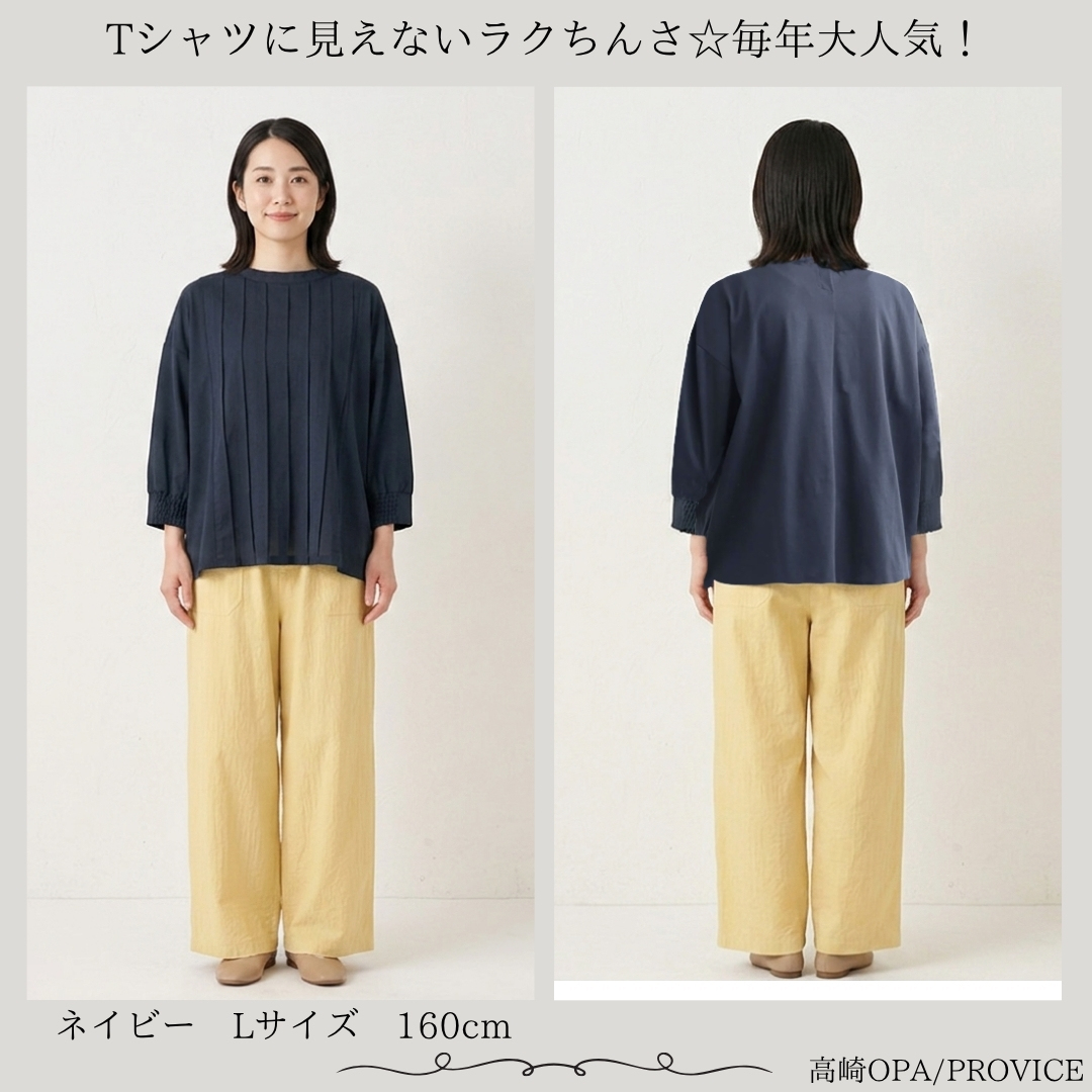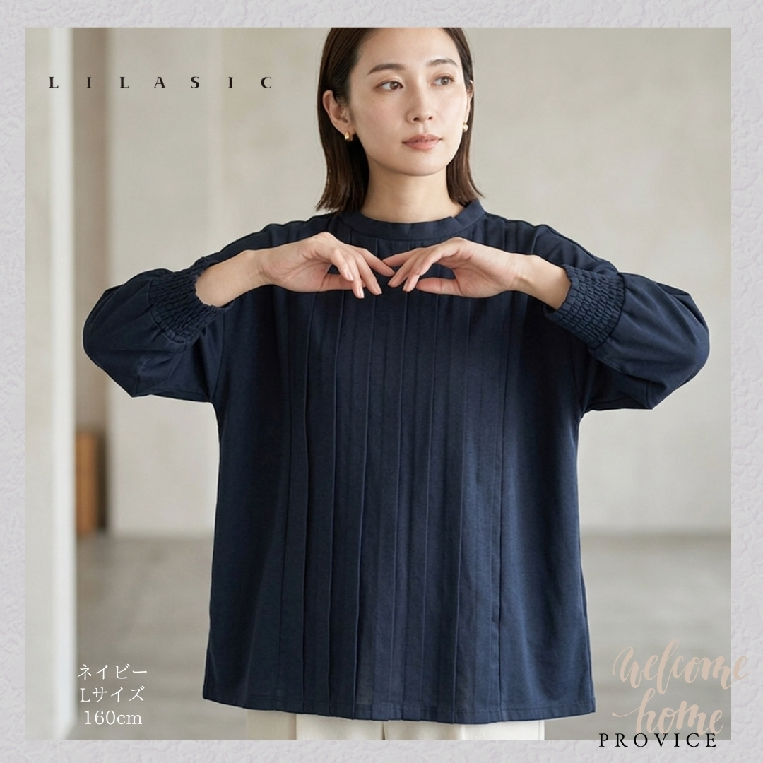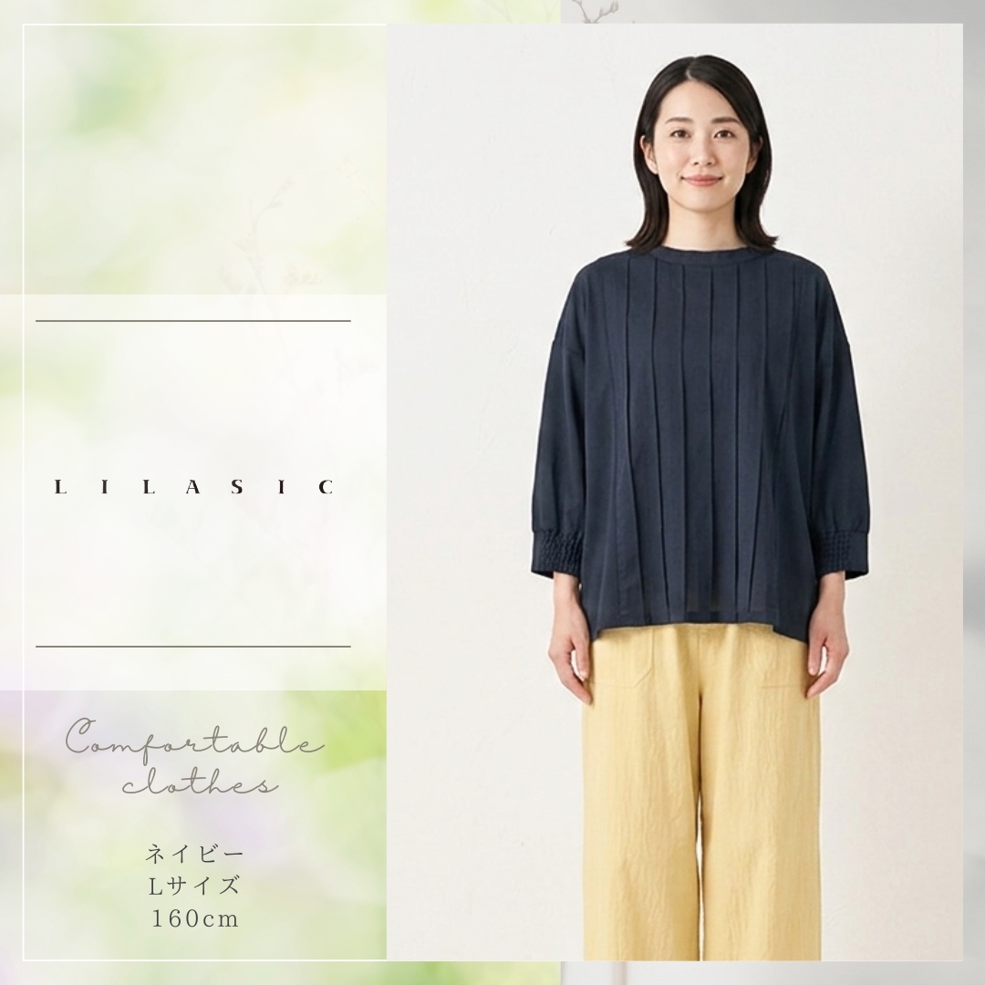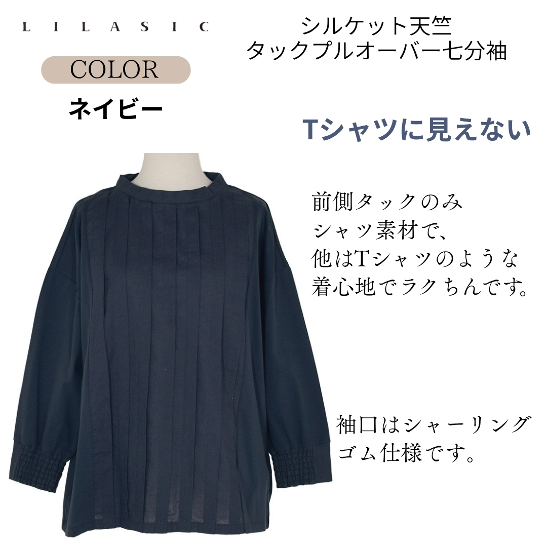 LILASIC/SBCW6031/リラシク/シルケット天竺7分袖タックプルオーバー/タック布帛/天竺コットンT/長Tブラウス/綿100Tシャツ/七分袖T