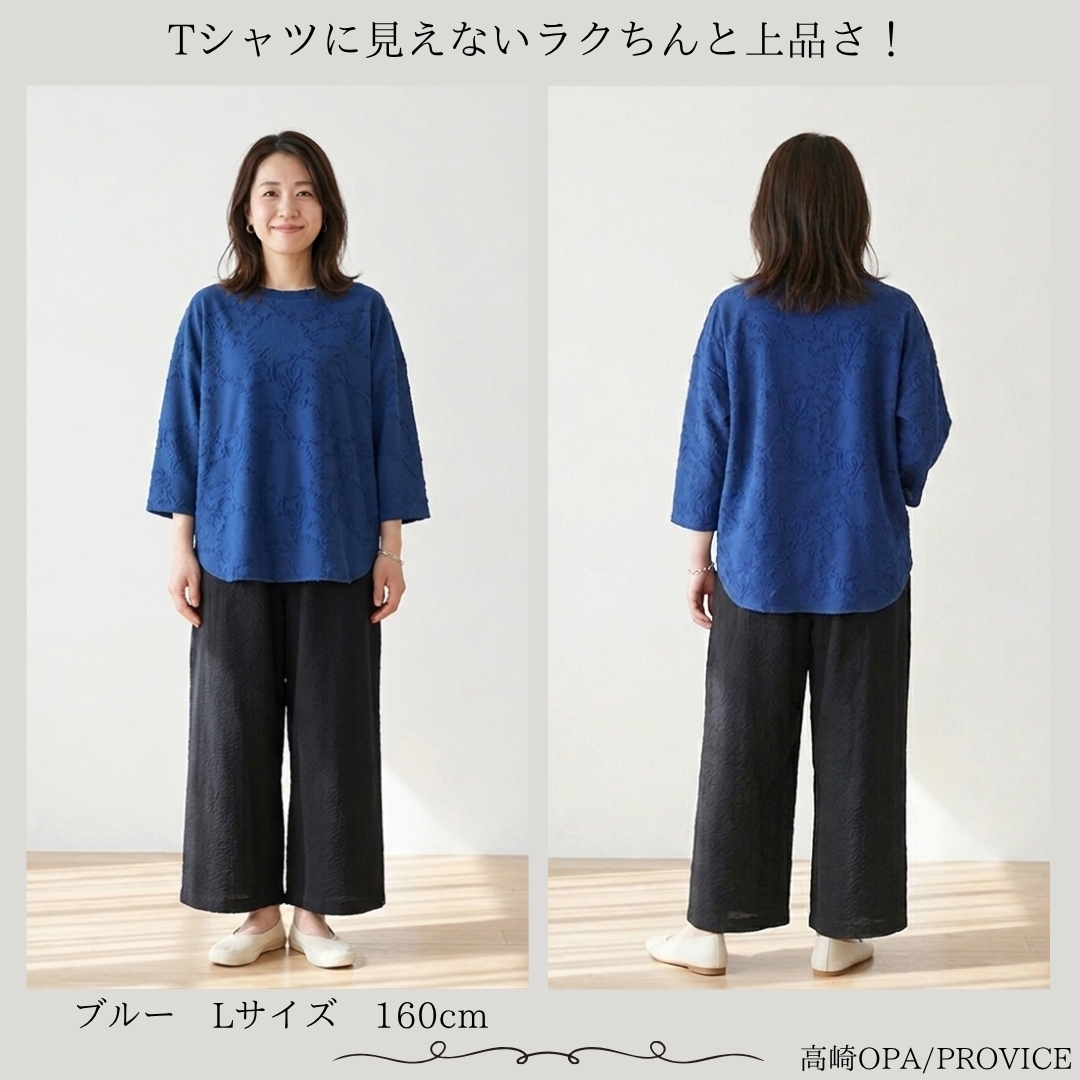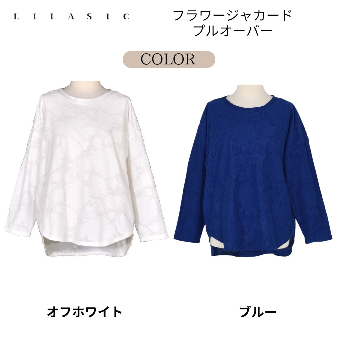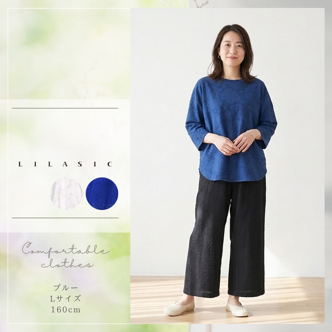 LILASIC/SBCE6035/リラシク/フラワージャカードプルオーバー/薄軽いトップス/春夏ジャガード/ラウンドヘムT/八分袖プルオーバー/上品ボトルネックT/上品長T