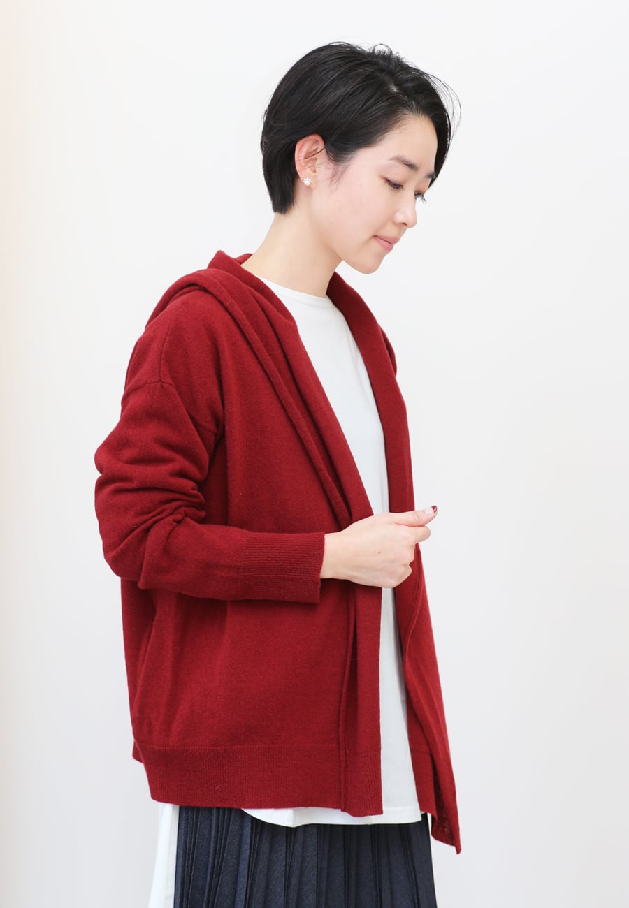 ウール100%のふんわりとした肌触りのフードカーディガンです。