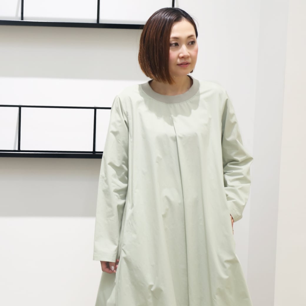 首元に使用したリブ使いは、頭が通しやすいのもポイント。ワンピースの配色と同色でデザインしています。女性らしく上品なフレアラインが魅力で、1枚で印象的な着こなしを表現できるワンピースです。両サイドポケット付。