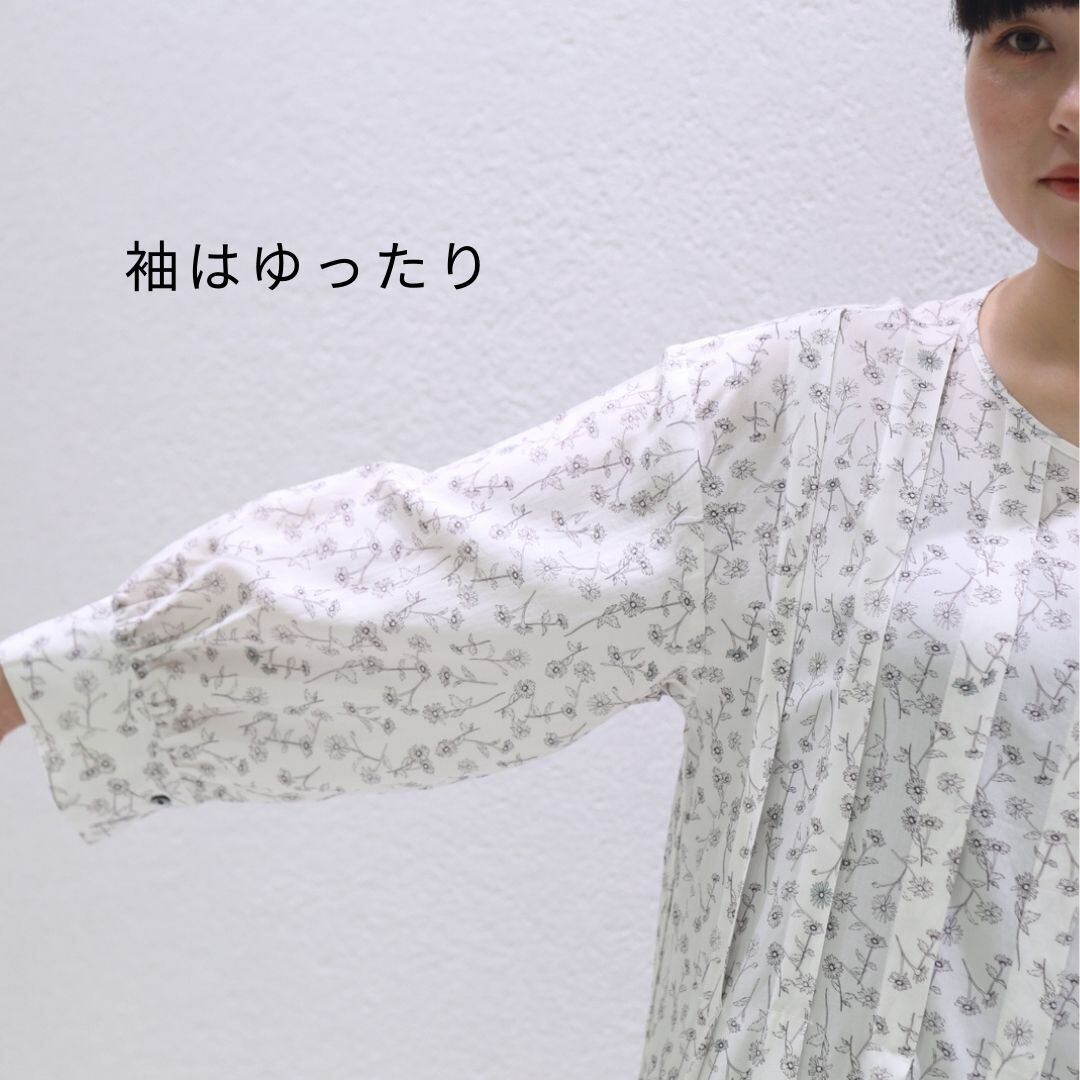 前側に長めのタックが入った花柄ワンピースです。